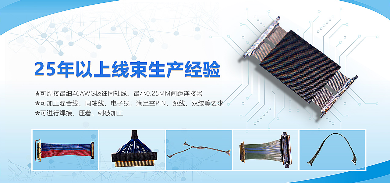 公司主營(yíng)極細(xì)同軸線束、車載信號(hào)線束、航空頭線束、RF射頻線、電子接插件、微動(dòng)開關(guān)等